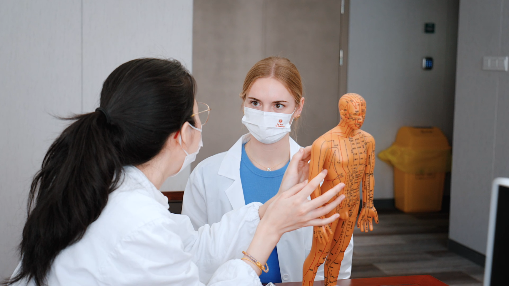 A student learns about the acupuncture points of the human body
